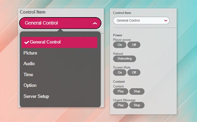 Users can adjust the settings of any registered signage with just a few clicks (Picture, Audio, Time, Option, Server Setup). Users can easily change the displayed content and other settings, making it easy to keep the digital signage displays are always upto-date and displaying the correct content. It even supports installing ‘Network Security Certification’ to on devices via LG Supersign CMS.