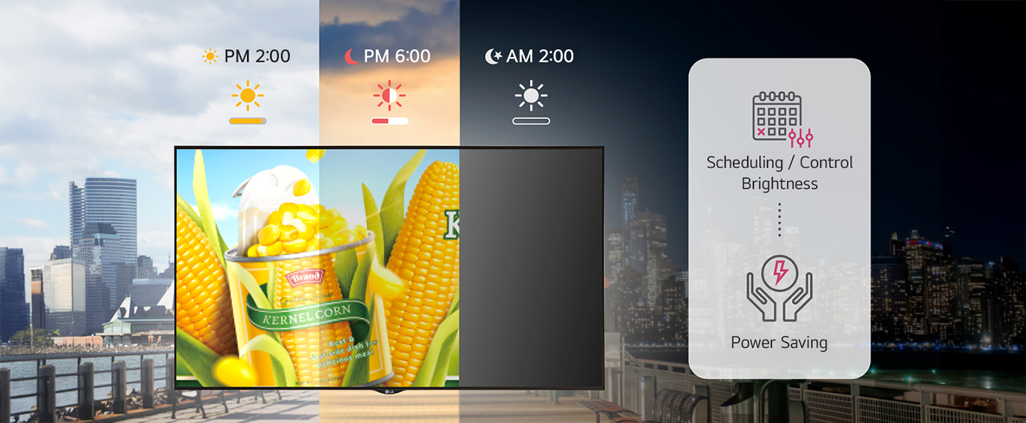The brightness level of digital signage displays is a major factor in determining their power consumption. LG SuperSign CMS provides convenient multi-device control, including brightness scheduling, which helps optimize power consumption.